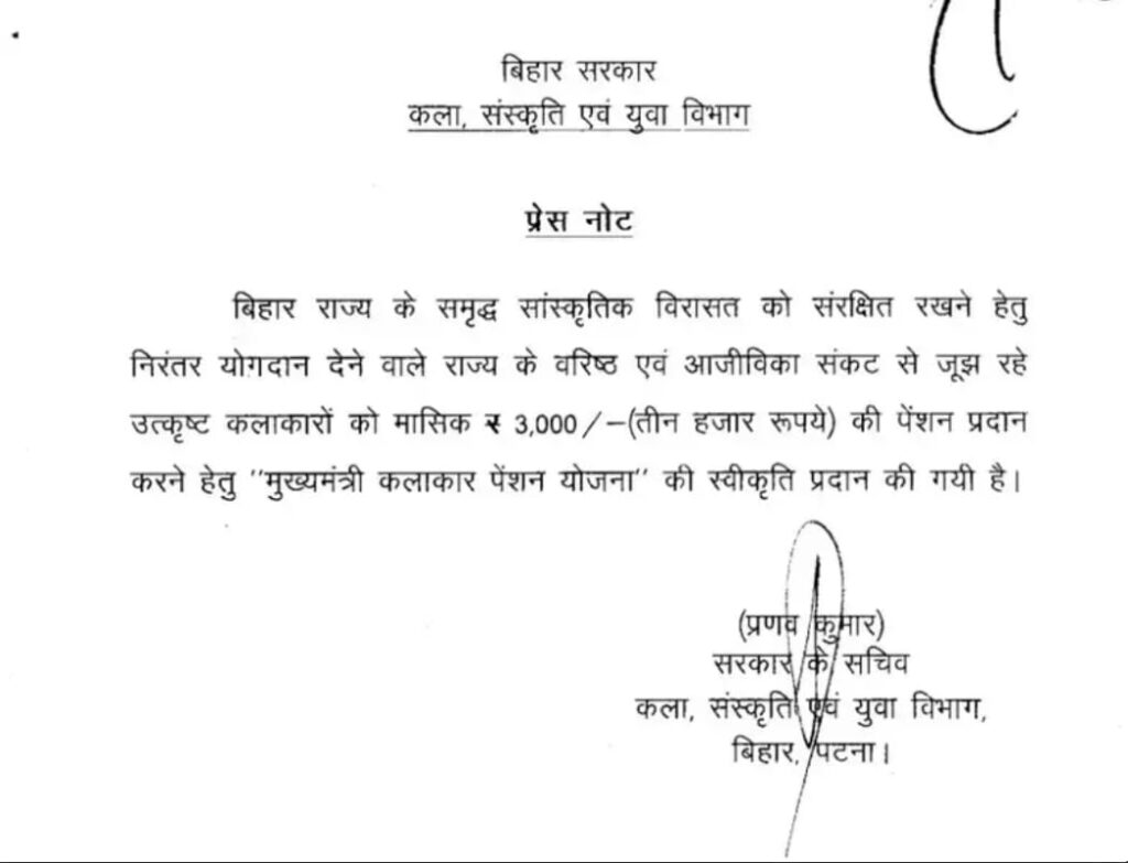 यह बिहार सरकार द्वारा शुरू की गई एक योजना है, जिसके तहत 50 वर्ष या उससे अधिक आयु के वरिष्ठ कलाकारों को हर महीने ₹3000 की पेंशन दी जाएगी। इसका मकसद कलाकारों को आर्थिक सहारा देना है।