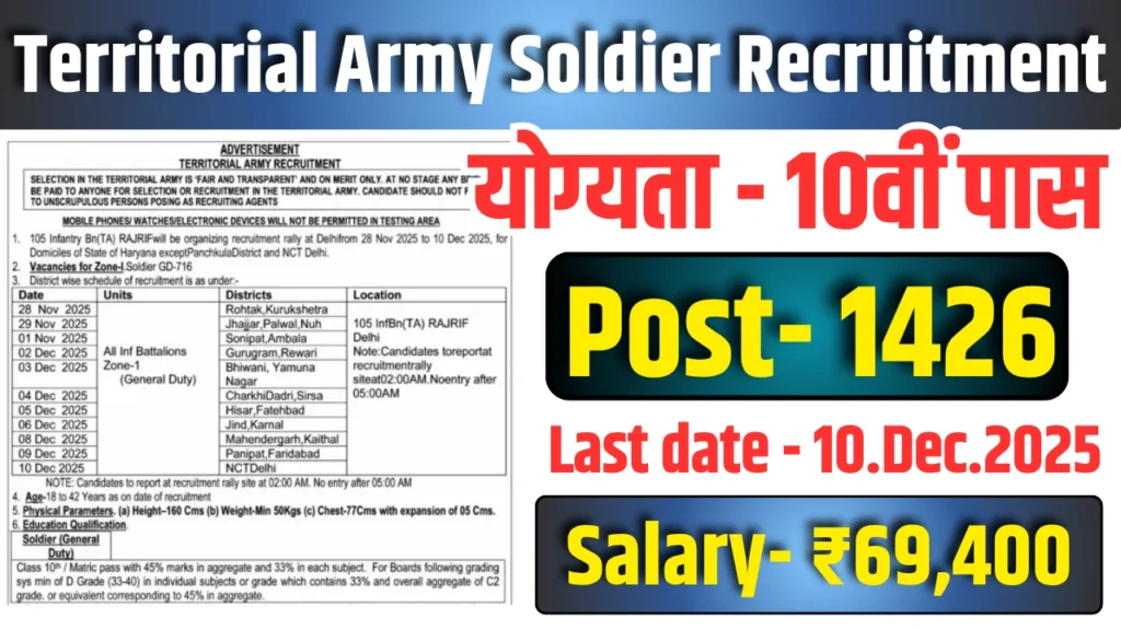 Territorial Army Soldier Recruitment 2025 : 1426 पदों के लिए रैली नोटिफिकेशन आउट – 15 नवंबर से आवेदन शुरू