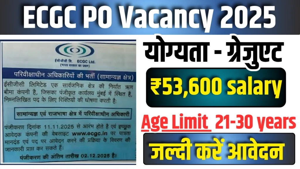 ECGC PO Bharti 2025 : ECGC Probationary Officer Bharti 2025 Notification Out जारी कर दिया गया है। जी हां, इसकी शॉर्ट ऑफीशियली नोटिफिकेशन जारी कर दी गई है। ECGC PO Vacancy 2025 को लेकर आवेदन प्रक्रिया 11 नवंबर से शुरू कर दिया जाएगा और 2 दिसंबर 2025 आवेदन करने की अंतिम तिथि बताई गई है।