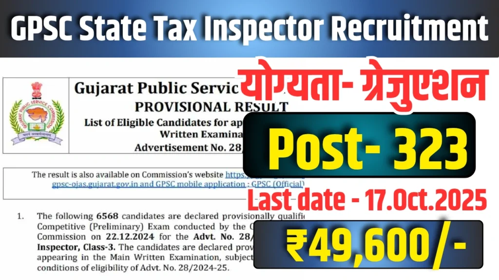 Gujarat Public Service Commission (GPSC) ने GPSC State Tax Inspector Vacancy 2025 को लेकर 323 पदों की भर्ती निकाली गई है। 3 अक्टूबर को ही इसकी ऑफिशल नोटिफिकेशन जारी कर दिया गया है।