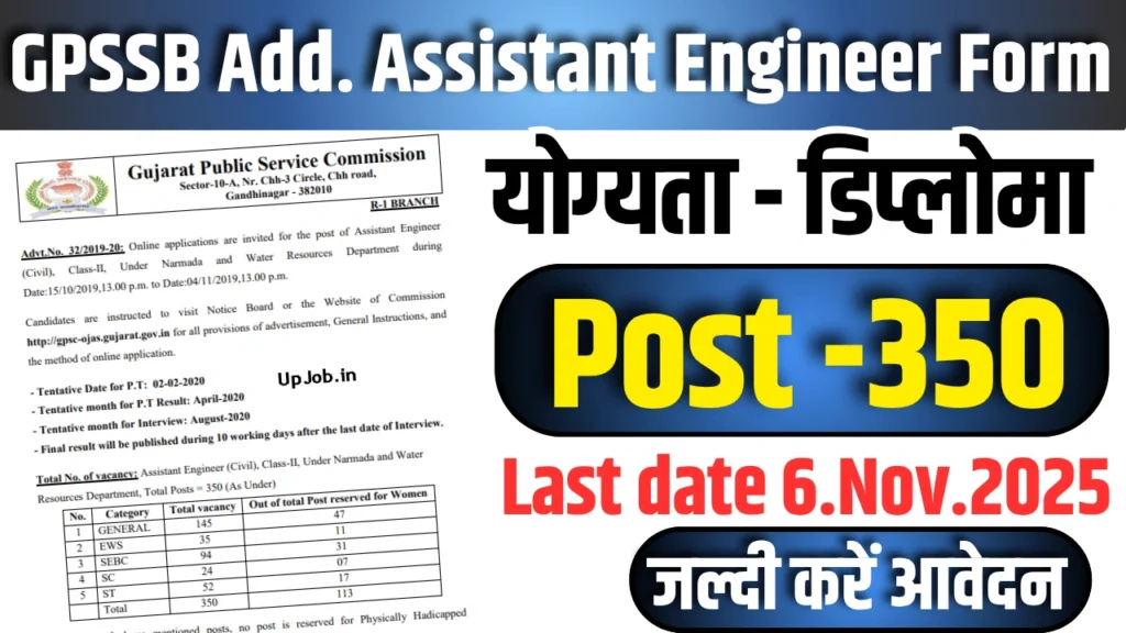 GPSSB Recruitment 2025 : GPSSB Additional Assistant Engineer Recruitment 2025 Notification Out कर दिया गया है। GPSSB Additional Assistant Engineer Vacancy 2025 को लेकर आवेदन प्रक्रिया 7 अक्टूबर से शुरू की गई है और इसकी अंतिम तिथि आवेदन करने के लिए 6 नवंबर 2025 तक चलने वाली है।