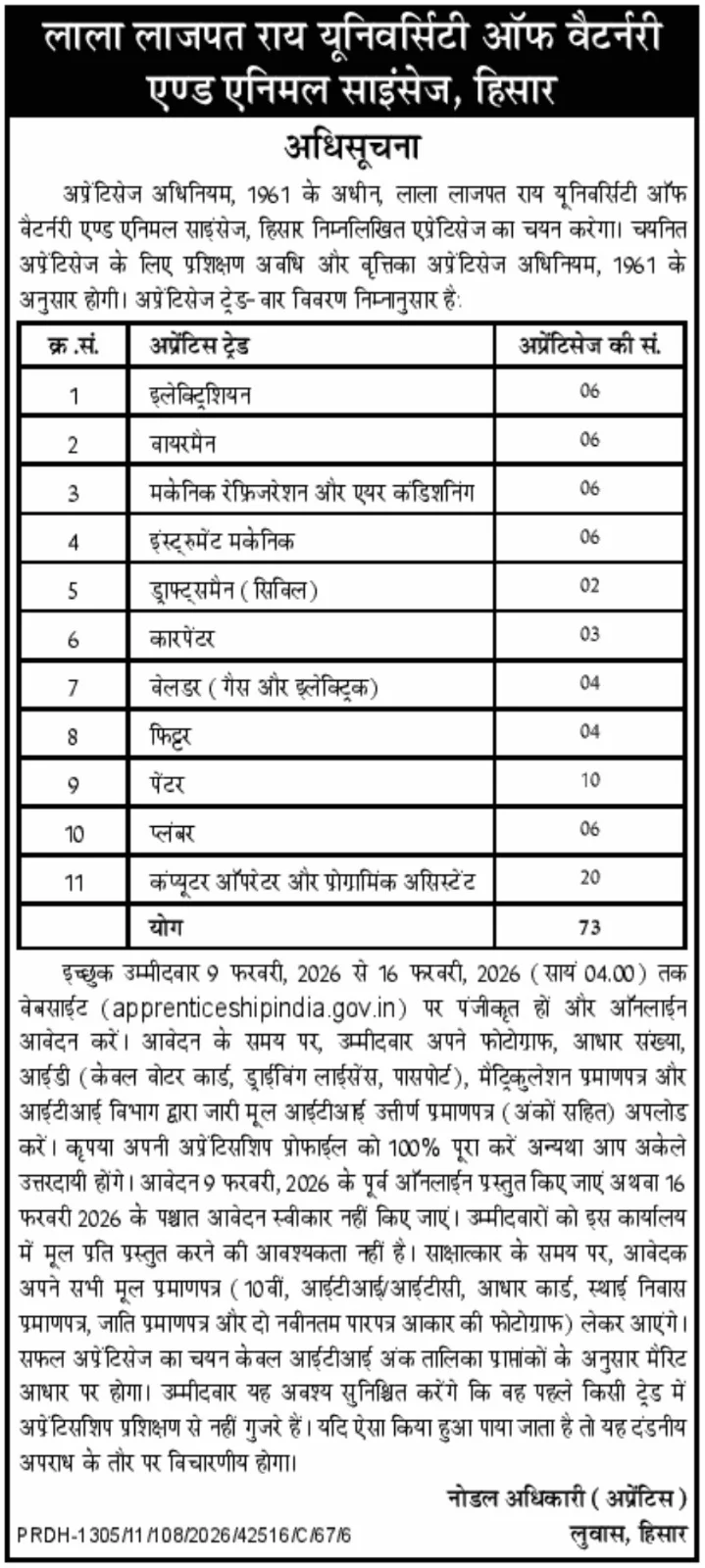 Hisar LUVAS Apprentice Bharti 2026 के लिए ऑनलाइन आवेदन प्रक्रिया 9 फरवरी 2026 से शुरू हो चुकी है और उम्मीदवार 16 फरवरी 2026 शाम 04:00 बजे तक आवेदन कर सकते हैं। इसके बाद कोई भी फॉर्म स्वीकार नहीं किया जाएगा।