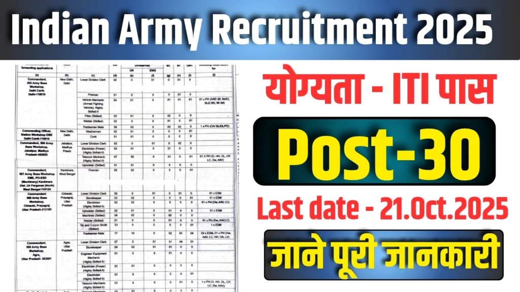 Indian Army Vacancy 2025 को लेकर नोटिफिकेशन जारी कर दिया गया है जहां पर टोटल 30 पदों की भर्ती निकाली गई है जिसके लिए उम्मीदवारों की उम्र अधिकतम 27 वर्ष निर्धारित की गई है, वही पर न्यूनतम उम्र उम्मीदवारों के लिए 20 वर्ष निर्धारित की गई है इसकी आवेदन प्रक्रिया 6 नवंबर 2025 तक चलने वाले हैं, बाकी जानकारी के लिए आर्टिकल को पूरा पढ़ने का प्रयास करें।