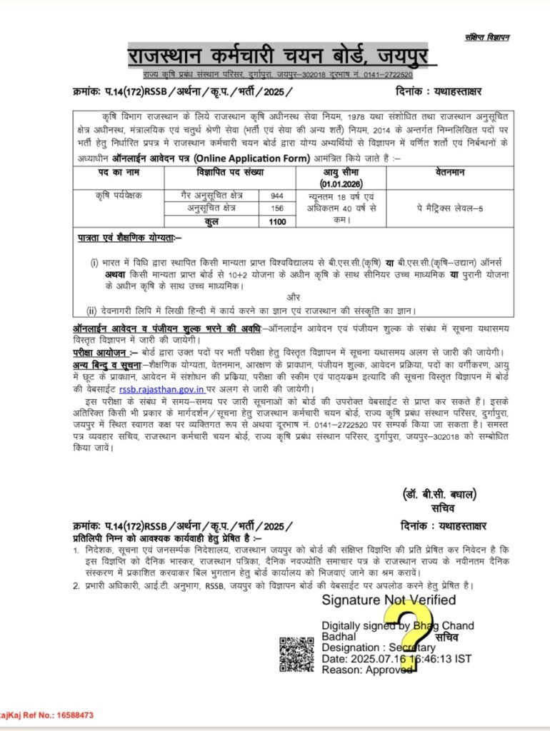 Rajasthan Staff Selection Board (RSSB) ने कृषि पर्यवेक्षक के 1100 पदों पर भर्ती हेतु अधिसूचना जारी की है। 16 जुलाई को ही RSSB Agriculture Supervisor Online Registration Form 2025 के लिए नोटिफिकेशन जारी कर दिया है।