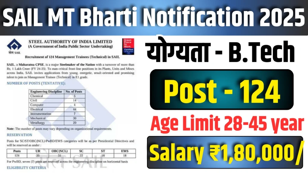 SAIL MT Vacancy 2025 को लेकर टोटल 124 पदों की भर्ती निकाली गई है।